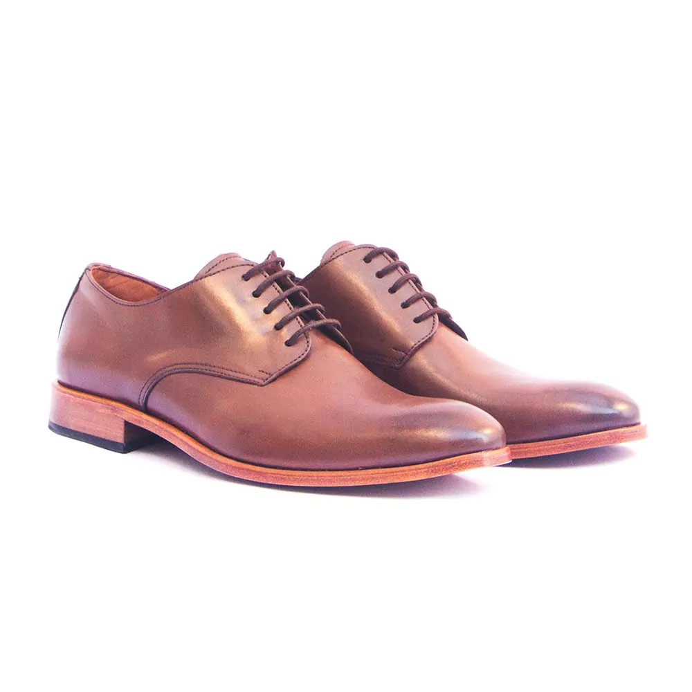 Zapato de cuero vacuno armado de capellada lisa, con terminación natural y simple suela de cuero.